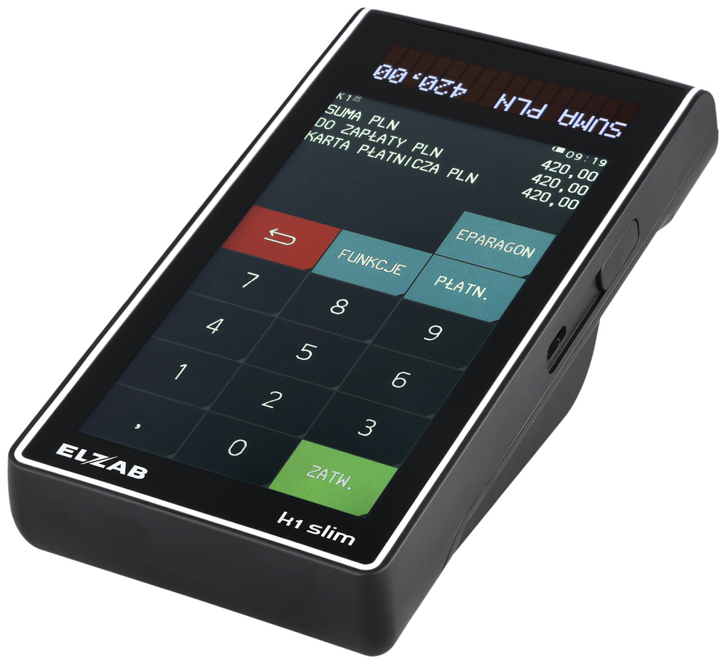 ELZAB K1 Slim to kieszonkowa kasa fiskalna ONLINE zamknięta w unikalnej obudowie o rozmiarze zbliżonym do smartfona. Mobilna, poręczna i lekka – bez trudu mieści się w dłoni, torebce czy kieszeni.